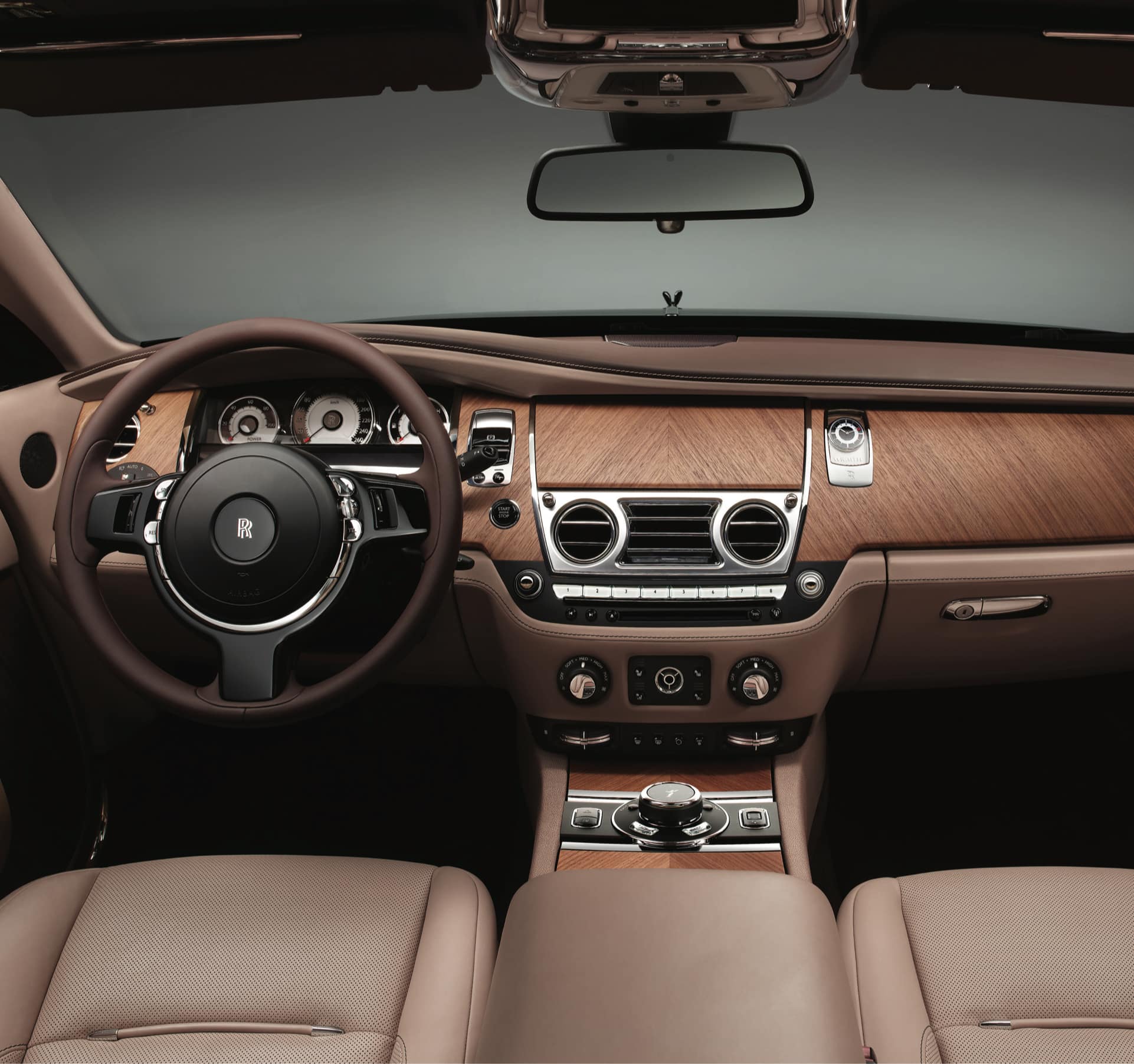 This crafted wood contributes to Wraith’s warm, contemporary ambience. The veneer is book matched throughout and gently curves to hug the contours of the coach doors, adding a sweep of open grain throughout the rear cabin and the fascia.