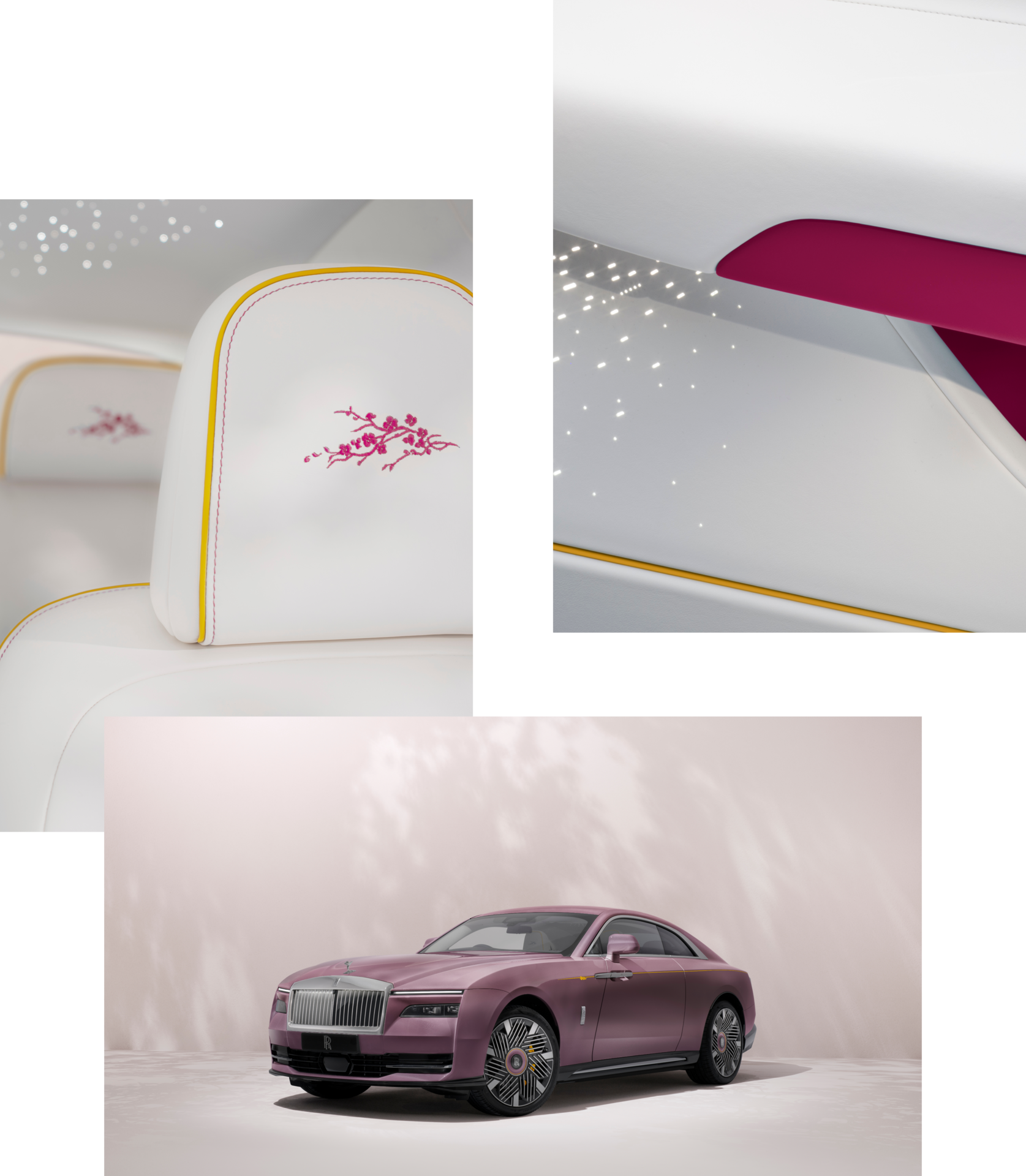 Above, the headrests bear silhouette-stitched blossoms.
